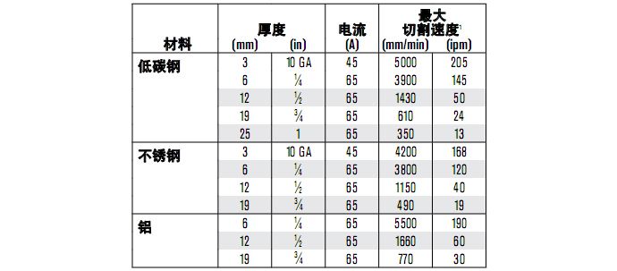 最大切割速度系根據(jù) Hypertherm 實驗室測試所得的結(jié)果。為實現(xiàn)最佳切割性能,實際切割速度可能會隨不同的切割應用而有所不同。有關更多詳情,請參考《操作手冊》。